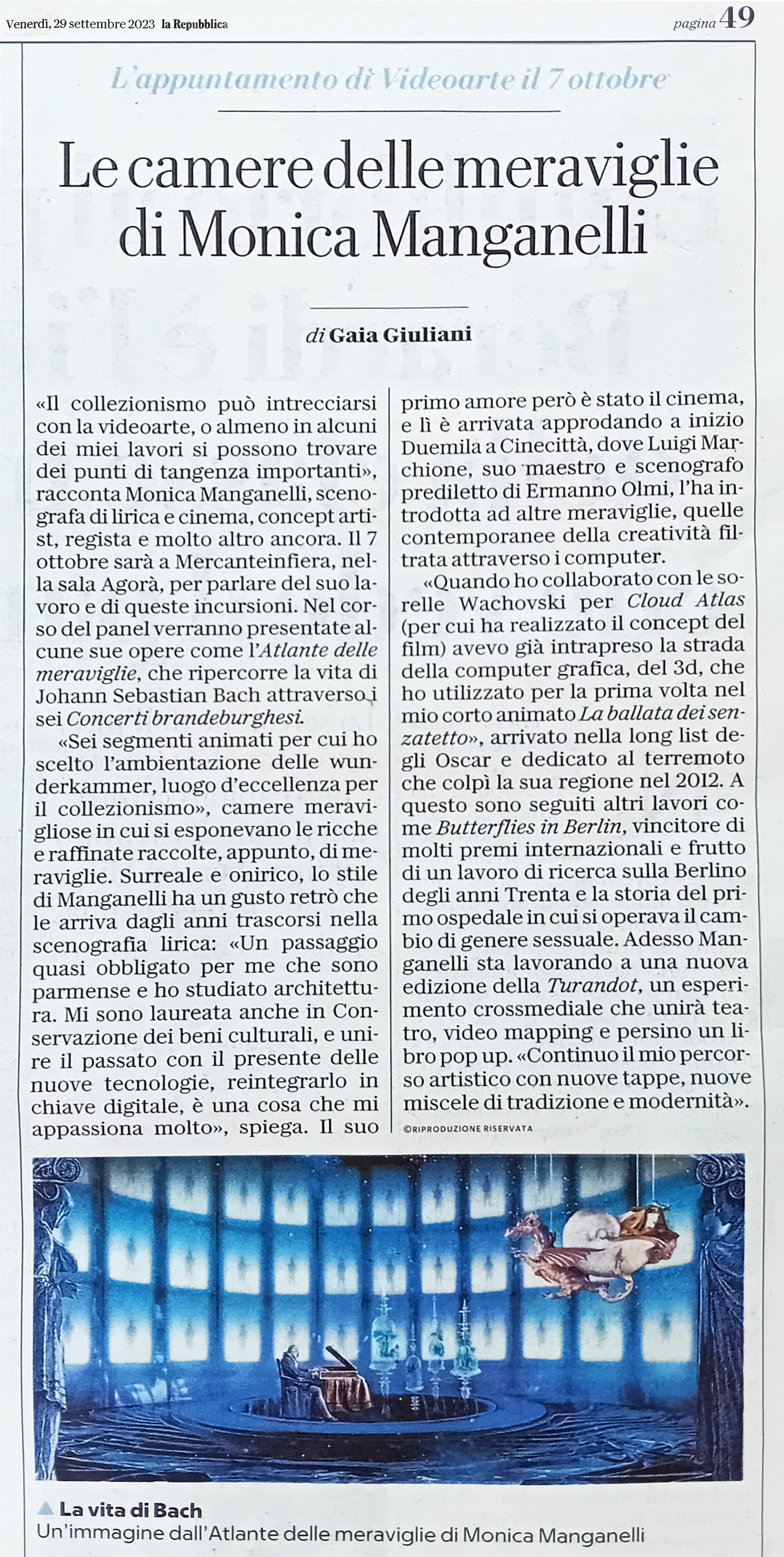 -REPUBBLICA-29 settembre/2023, LE CAMERE DELLE MERAVIGLIE DI MONICA MANGANELLI
